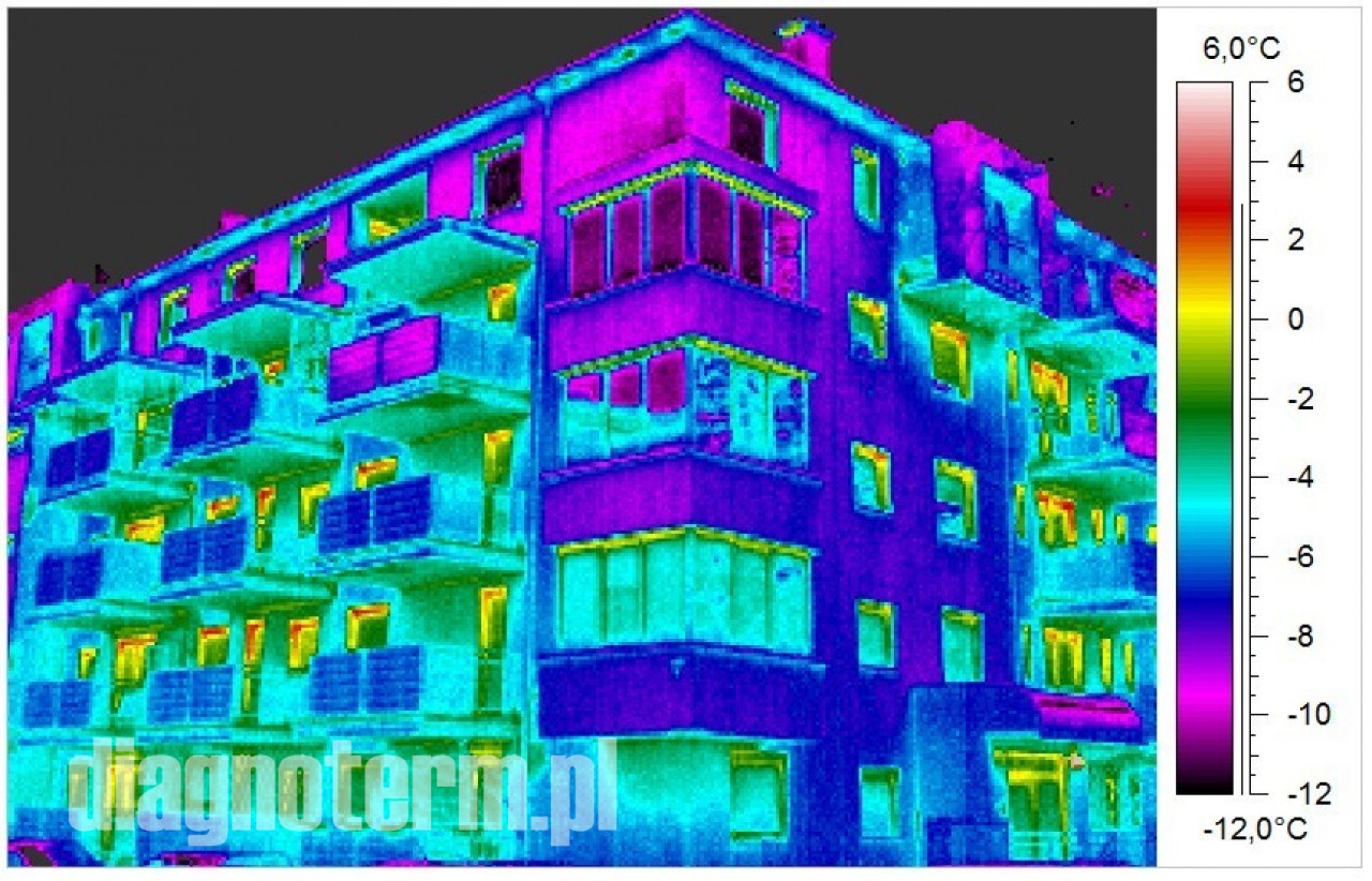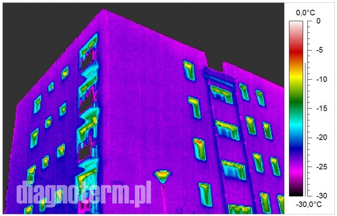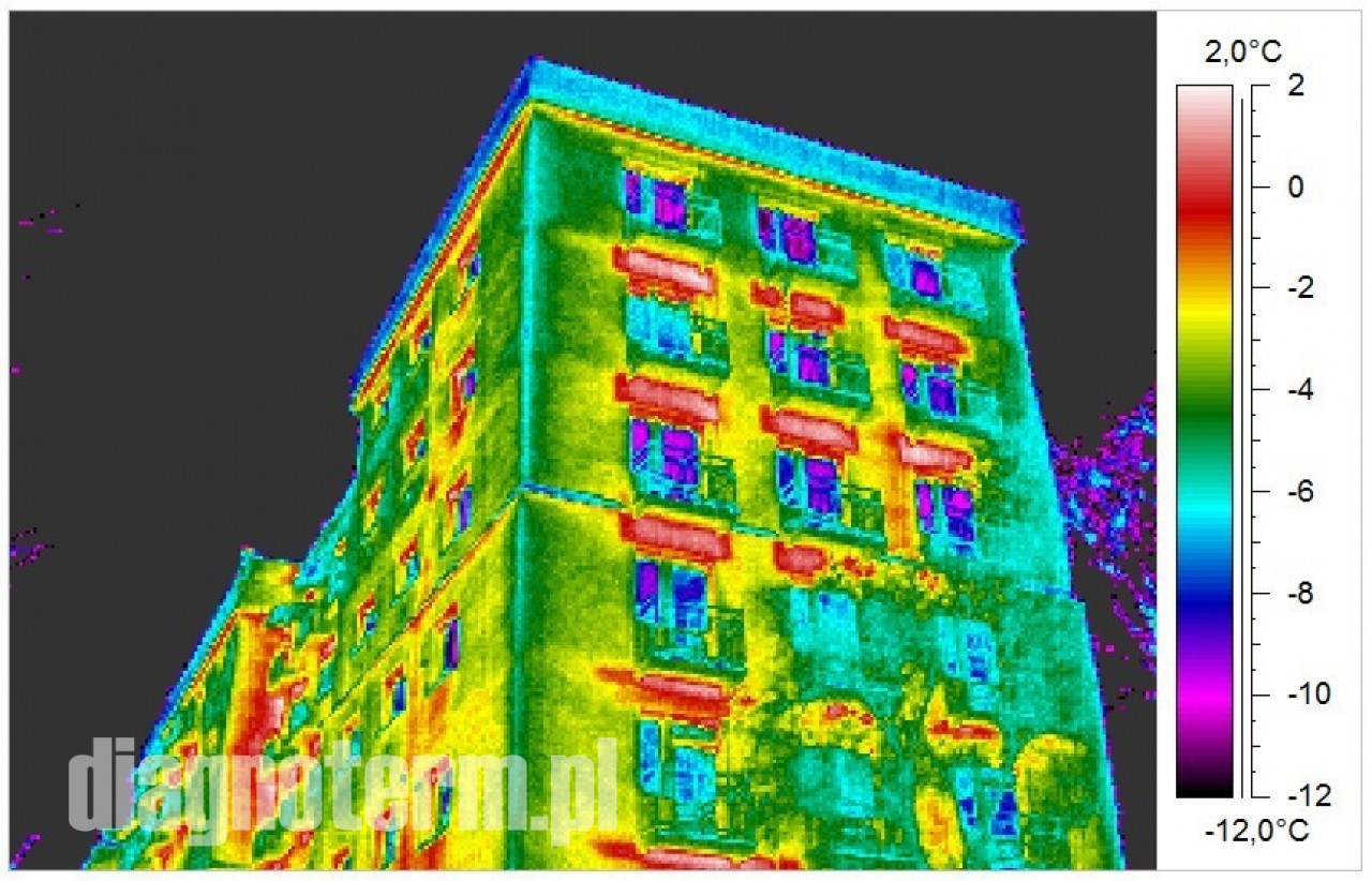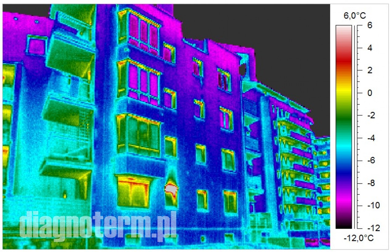 Powierzchnie ścian budynków wielorodzinnych badamy zazwyczaj od zewnątrz ze stosunkowo dużych odległości. Jeżeli z różnych względów niemożliwe jest odpowiednie oddalenie się od obiektu to wówczas poszczególne termogramy łączymy specjalistycznymi programami w jedną całość. Bardzo dobre rezultaty przynosi wykonanie termogramów podczas częściowej termorenowacji co pokazuje bezpośrednio spadek temperatury powierzchni ścian po dociepleniu i przed dociepleniem.