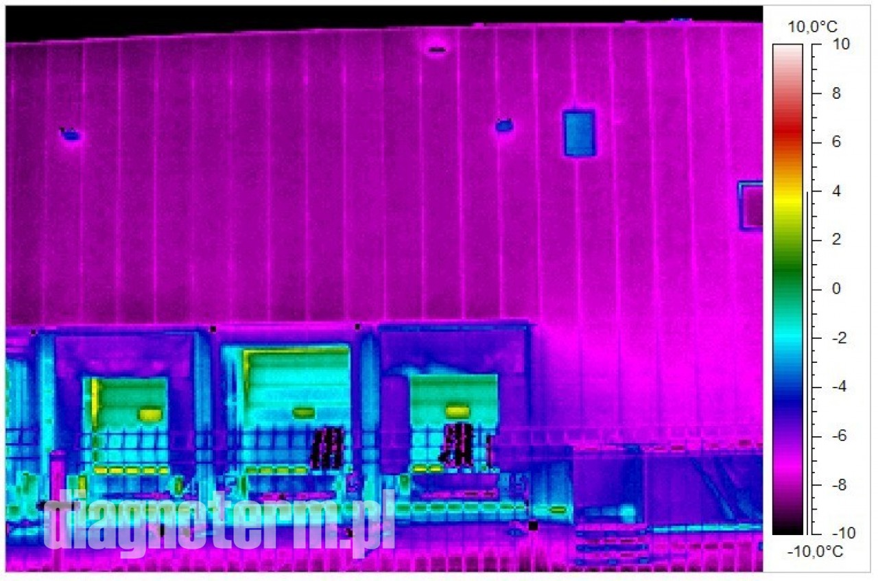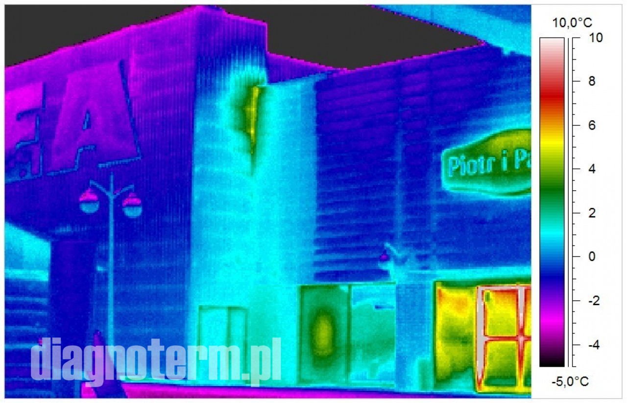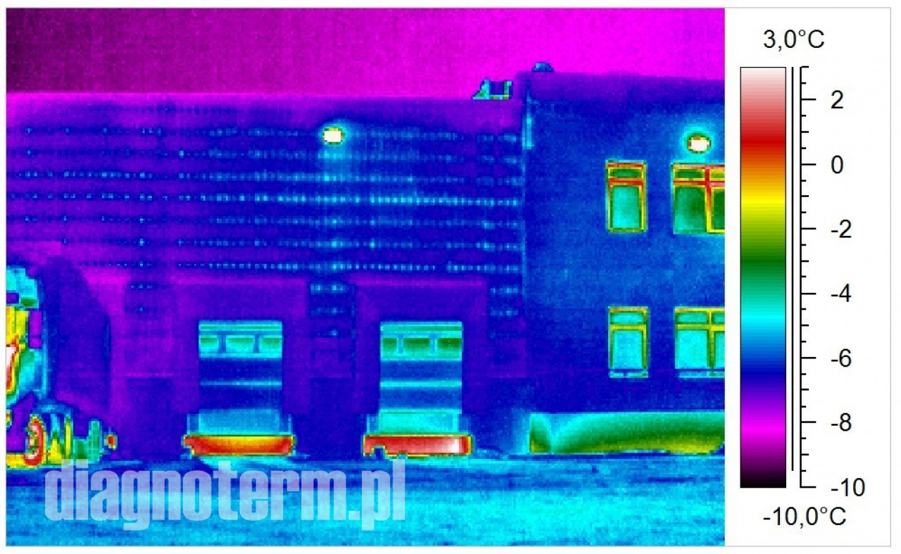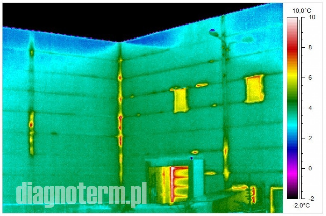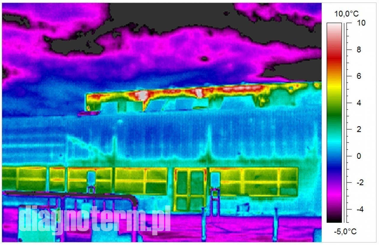 Pogorszenie termoizolacji hal i budynków powoduje nie tylko podwyższenie kosztów ich utrzymania i pogorszenie komfortu pracy załogi ale również po przekroczeniu pewnej granicy wykraplanie się pary wodnej. Jeżeli taki stan utrzymuje się odpowiednio długo to może dojść do zagrzybienia. Kamera termowizyjna pozwala bardzo precyzyjnie znaleźć takie punkty na powierzchni ścian i dachów.