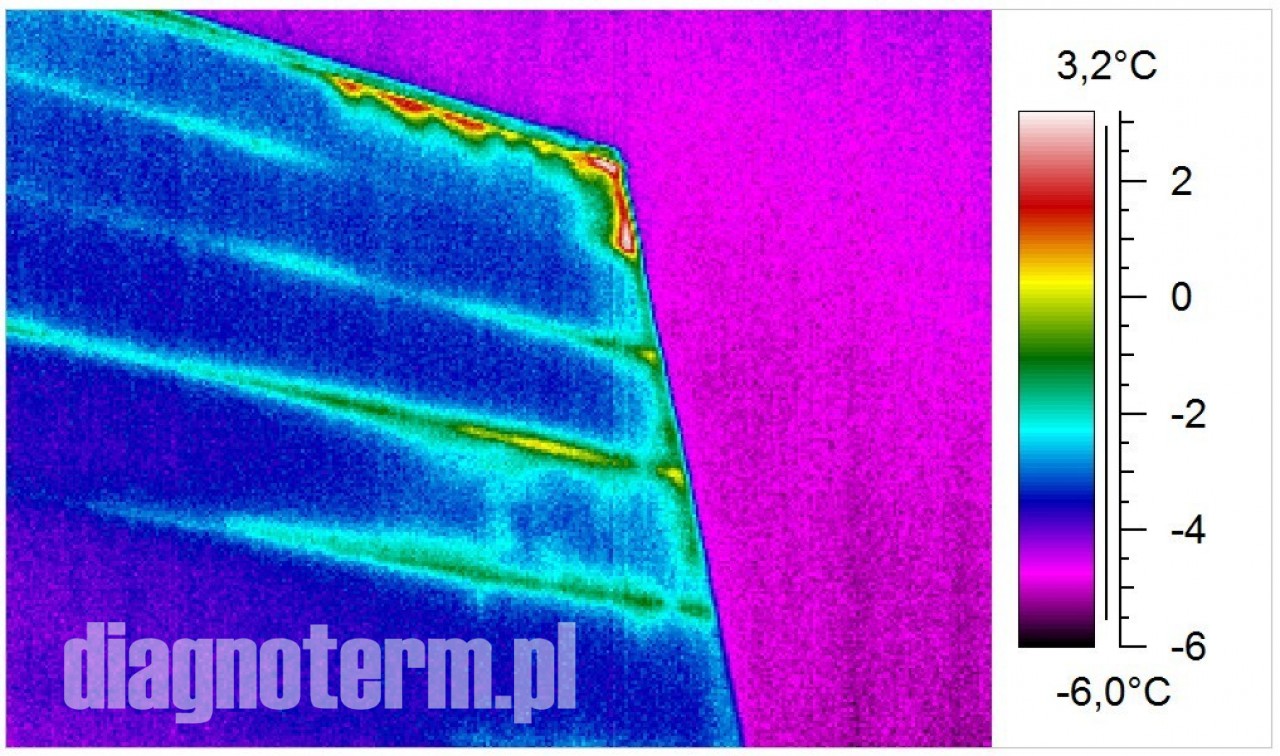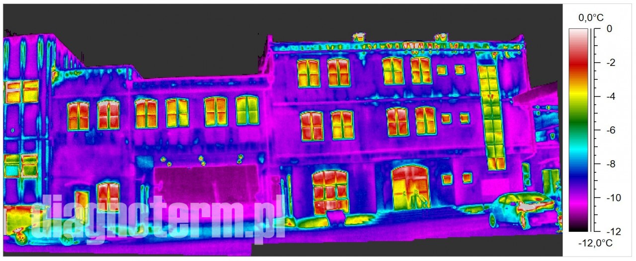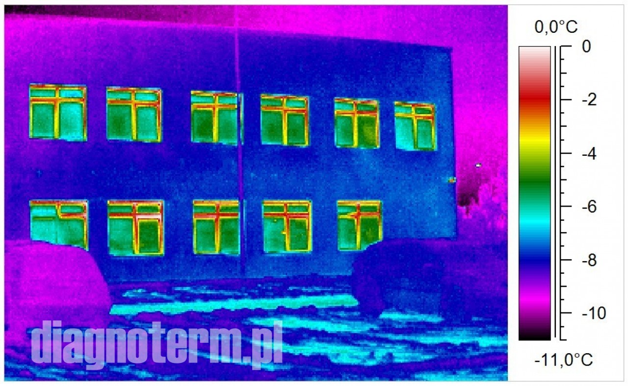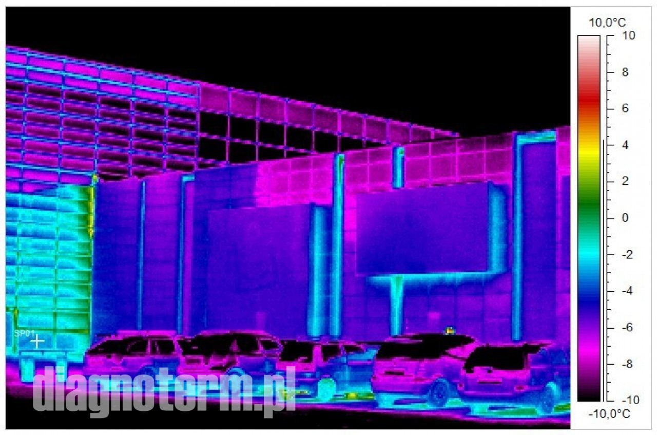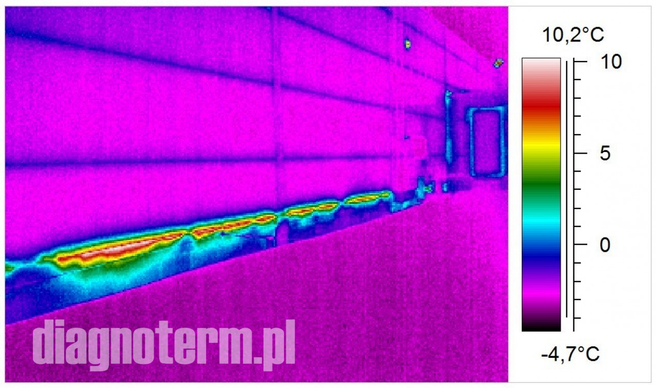 Pogorszenie termoizolacji hal i budynków powoduje nie tylko podwyższenie kosztów ich utrzymania i pogorszenie komfortu pracy załogi ale również po przekroczeniu pewnej granicy wykraplanie się pary wodnej. Jeżeli taki stan utrzymuje się odpowiednio długo to może dojść do zagrzybienia. Kamera termowizyjna pozwala bardzo precyzyjnie znaleźć takie punkty na powierzchni ścian i dachów.